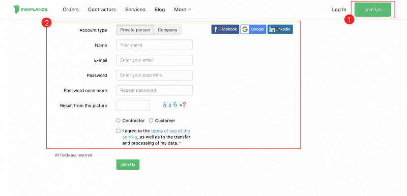 Choose Account type: If you are registering on your own behalf, select «Private person», if you are registering on behalf of a company, select «Company».
